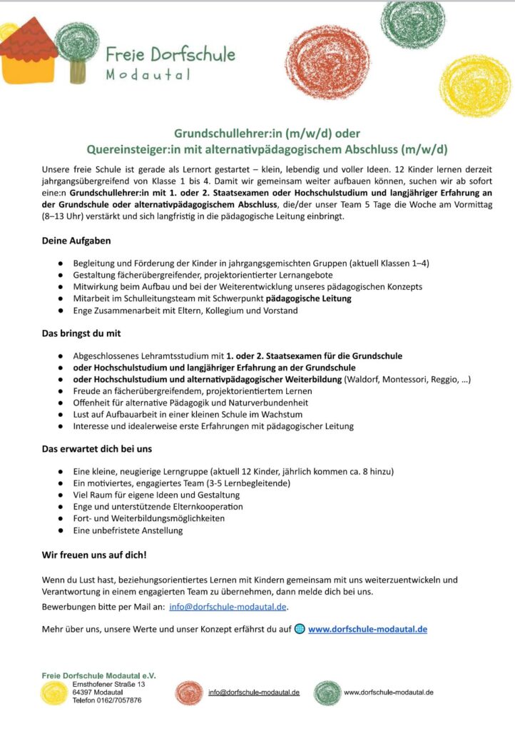 Wenn du Teil unseres engagierten Teams werden und gemeinsam mit uns an einer individuellen und naturverbundenen Bildung arbeiten möchtest, freuen wir uns auf deine Bewerbung.